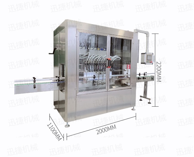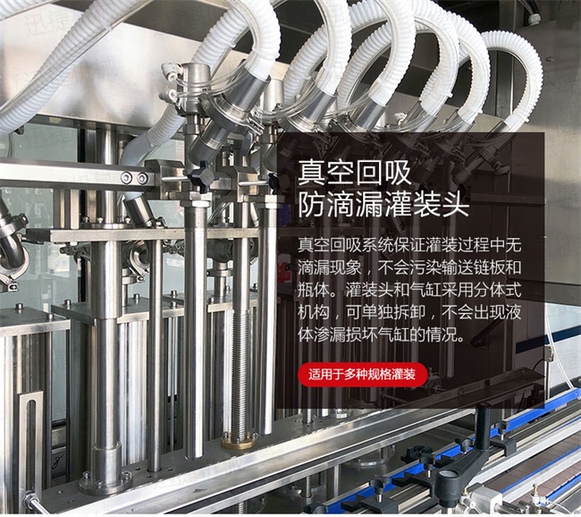 1.真空回吸系統(tǒng)保證灌裝過程中無滴漏現(xiàn)象,不會污染輸送鏈板和瓶體。灌裝頭和氣缸采用分體式機構(gòu),可單獨拆卸,不會出現(xiàn)液體滲漏損壞氣缸的情況。進口亞德客氣缸經(jīng)久耐用,其他密封等配件使用標準件,更換維護簡單方便。