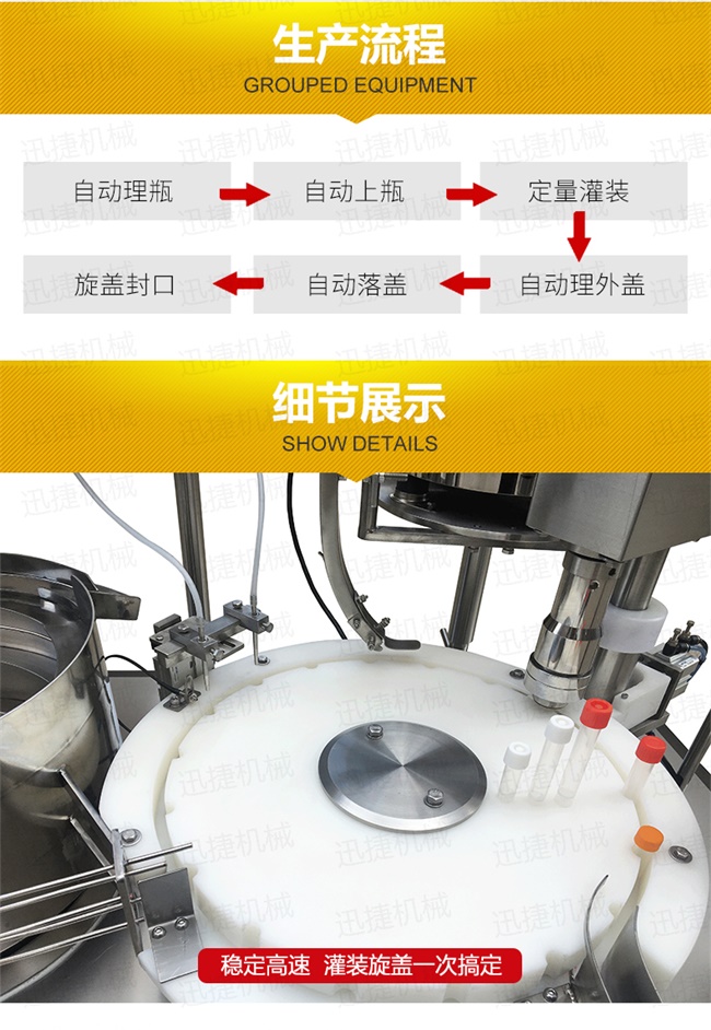 本機(jī)是在引進(jìn)和吸收國(guó)外技術(shù)的基礎(chǔ)上,由我公司自主研發(fā)的一款I(lǐng)VD診斷試劑灌裝旋蓋一體機(jī),能同時(shí)完成自動(dòng)理瓶、自動(dòng)上瓶、定量灌裝、自動(dòng)理蓋、上蓋和旋蓋封口等動(dòng)作。本機(jī)采用日本高精度封閉式凸輪分度工位器,精度高,運(yùn)行可靠,使用壽命長(zhǎng)。該分度器結(jié)構(gòu)簡(jiǎn)單,長(zhǎng)期使用無(wú)需維修。該型號(hào)設(shè)備主要用于ⅣD體外診斷試劑制藥、生物制藥行業(yè)及科研領(lǐng)域裝。機(jī)器設(shè)計(jì)緊湊合理、外形簡(jiǎn)潔美觀,灌裝量調(diào)節(jié)方便。