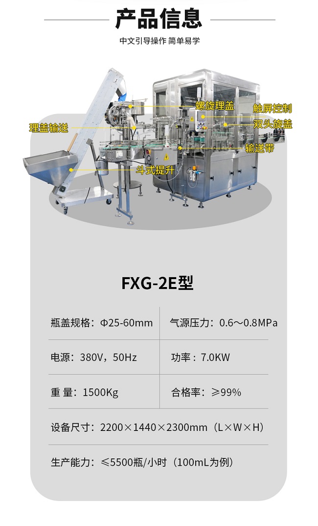 FXG-2E型全自動雙頭跟隨式旋蓋機由理蓋輸蓋機構(gòu)、抓蓋旋蓋機構(gòu)、運動模塊、