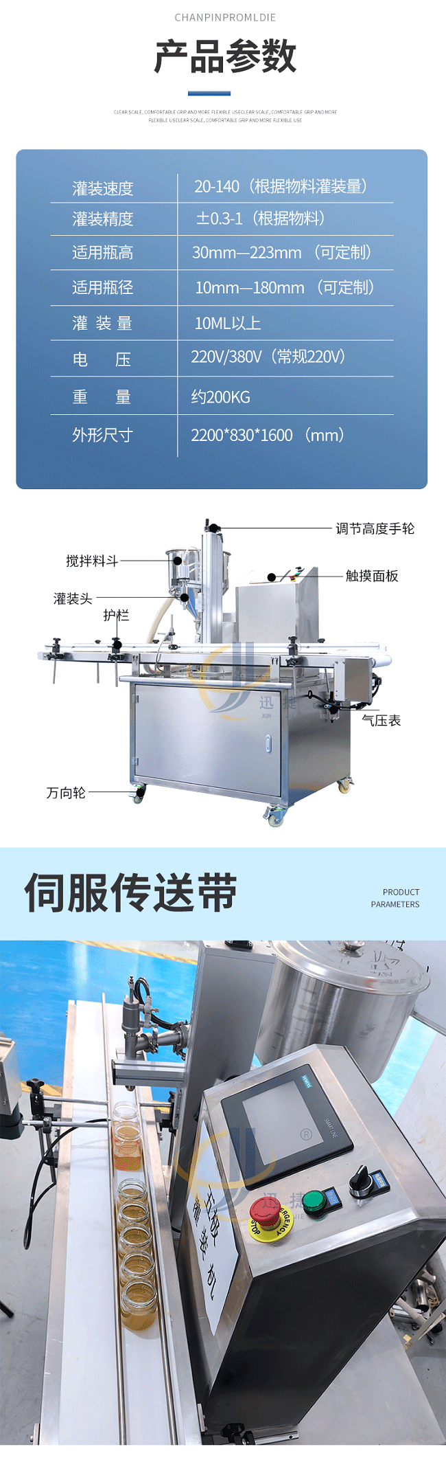 我公司新研發(fā)五極醬料灌裝機(jī),五極分為極快,極簡(jiǎn),極穩(wěn),極廣,極準(zhǔn),廣泛適用于各種膏霜、蜂蜜、洗衣液、洗發(fā)水、半流體、蜂蜜、醬料以及各種粘稠物料,該產(chǎn)品支持定制,選用306不銹鋼材質(zhì),灌裝精度高,防止滴漏,選用plc觸屏智能控制,防滴漏防拉絲,突破傳統(tǒng)的灌裝方式,可根據(jù)瓶子高度調(diào)整灌裝頭高度,采用防滴漏設(shè)計(jì),灌裝時(shí)不滴不漏。