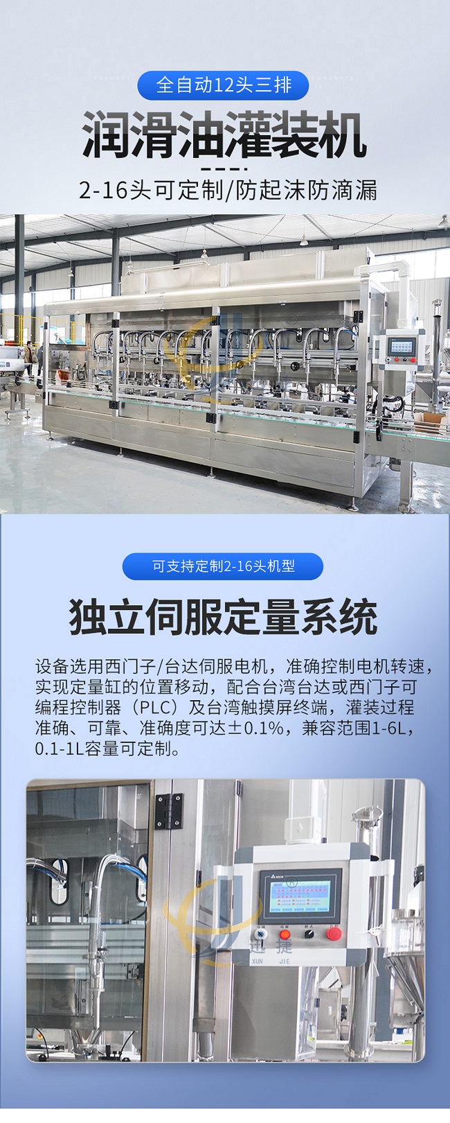這款全自動十二頭三排潤滑油灌裝機是本公司專為潤滑油廠家研發(fā)的自動化設(shè)備,這款潤滑油灌裝機2-16頭可定制,防起沫防滴漏。主要針對油脂包裝開發(fā)的專用灌裝設(shè)備。采用專用灌裝系統(tǒng):單頭單泵單變頻技術(shù)。具有灌裝速度快,精度高,無滴漏的特點。特別適合中高產(chǎn)能的油脂包裝企業(yè)使用。