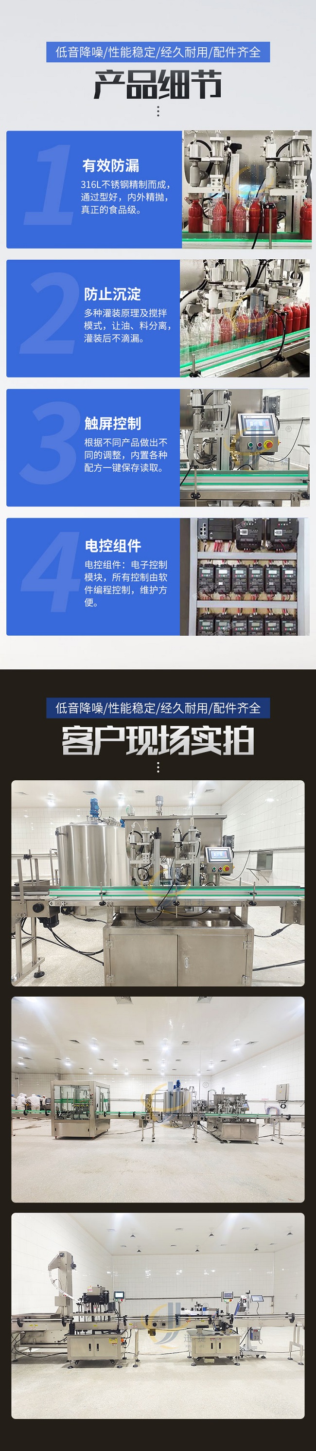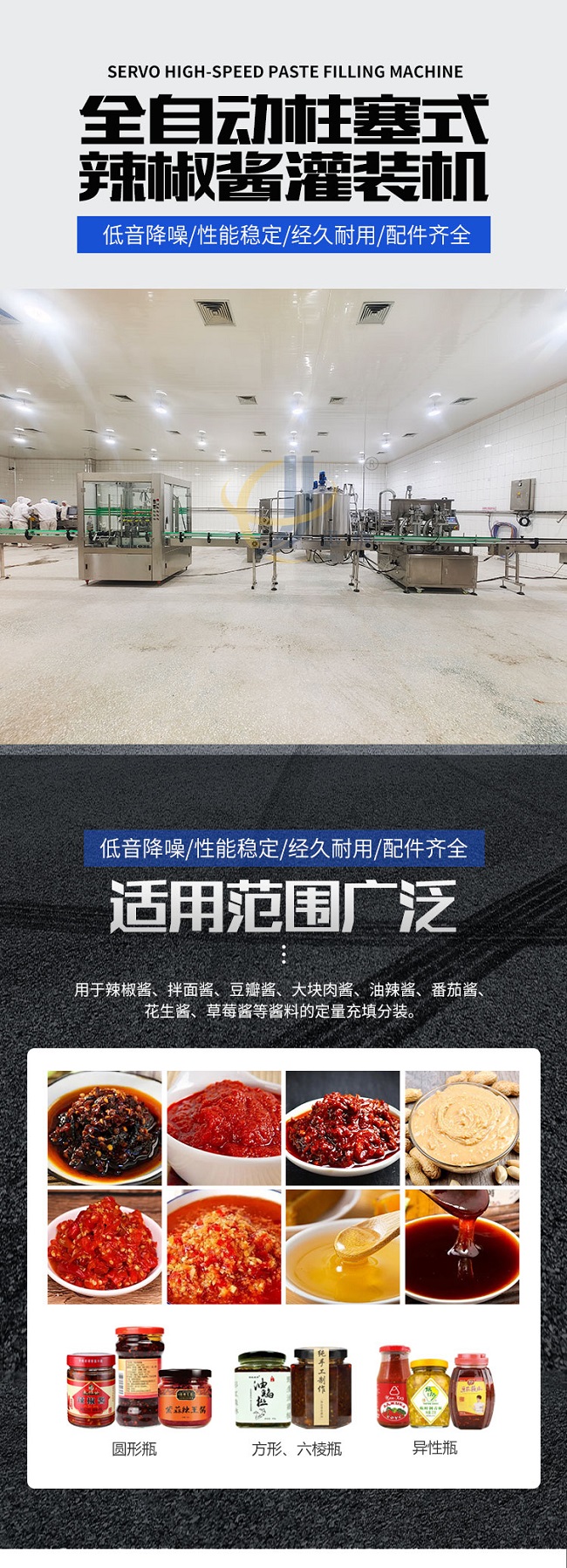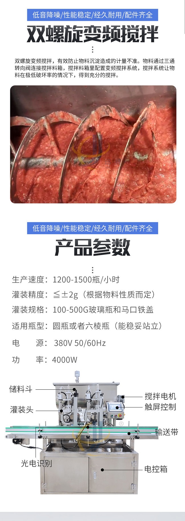 這款柱塞式辣椒醬灌裝機低音降噪、性能穩(wěn)定、經(jīng)久耐用、配件齊全,適用范圍廣泛用于辣椒醬、拌面醬、豆瓣醬、大塊肉醬、油辣醬、番茄醬花生醬、草莓醬等醬料的定量充填分裝。雙螺旋變頻攪拌,有效防止物料沉淀造成的計量不準。物料通過三通轉(zhuǎn)向閥連接攪拌料箱,攪拌料箱里配置變頻攪拌系統(tǒng),攪拌系統(tǒng)讓物料在極低破壞率的情況下,得到充分的攪拌。