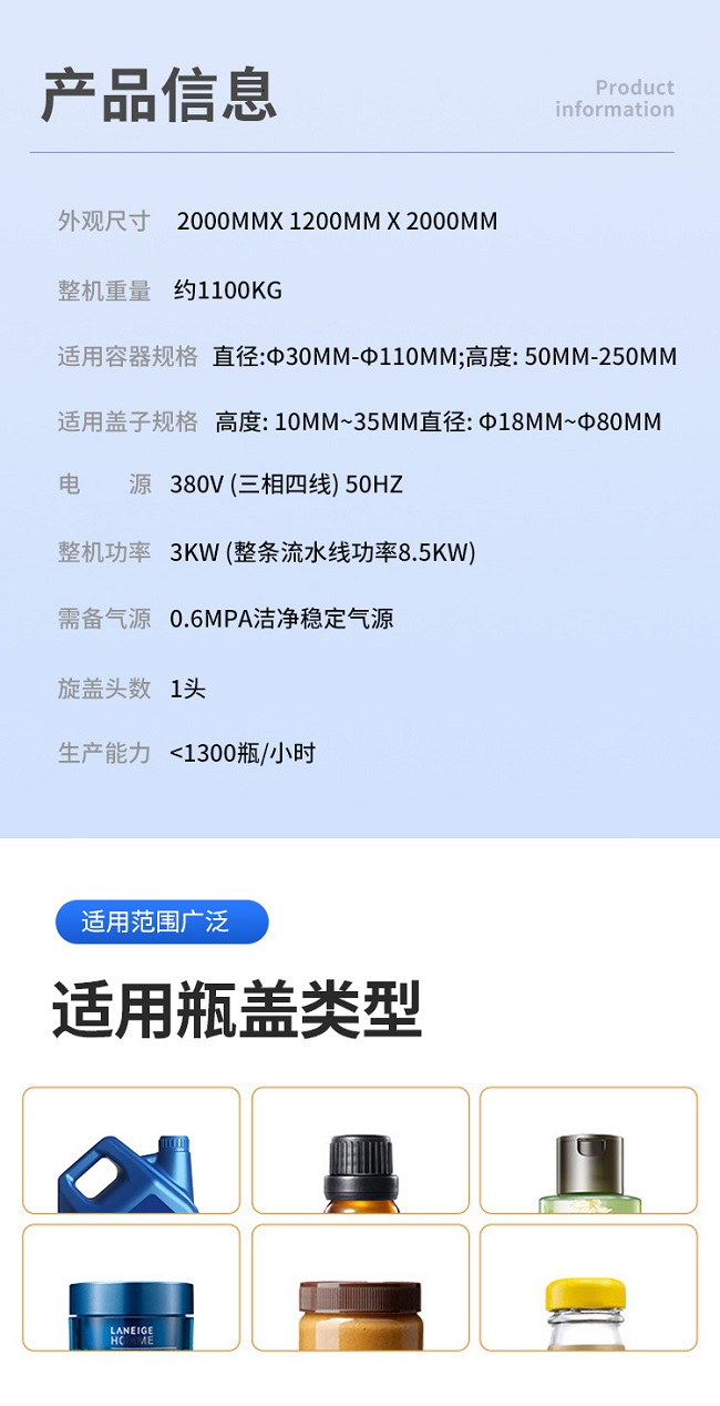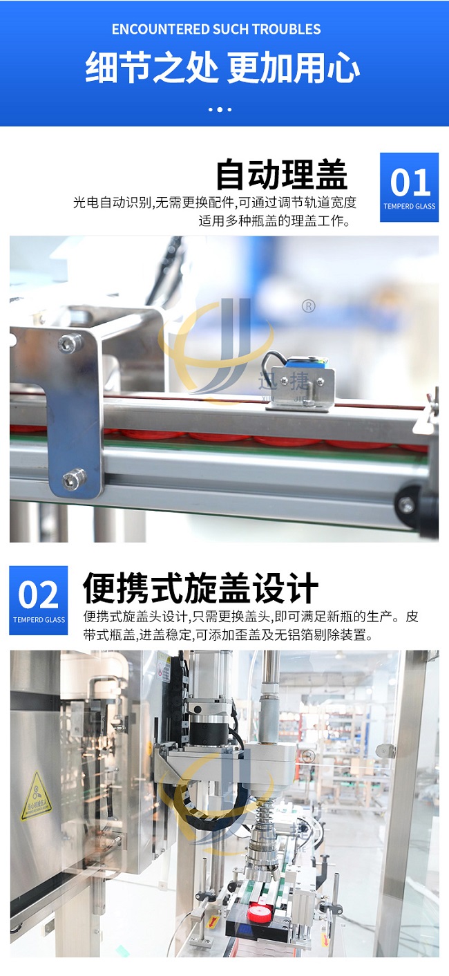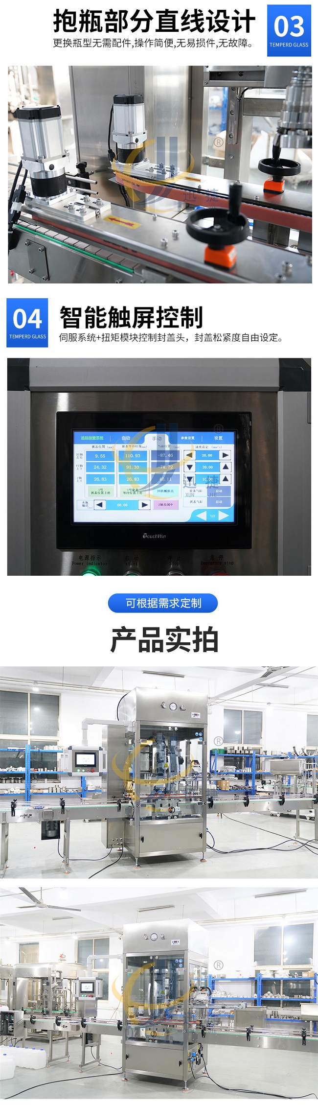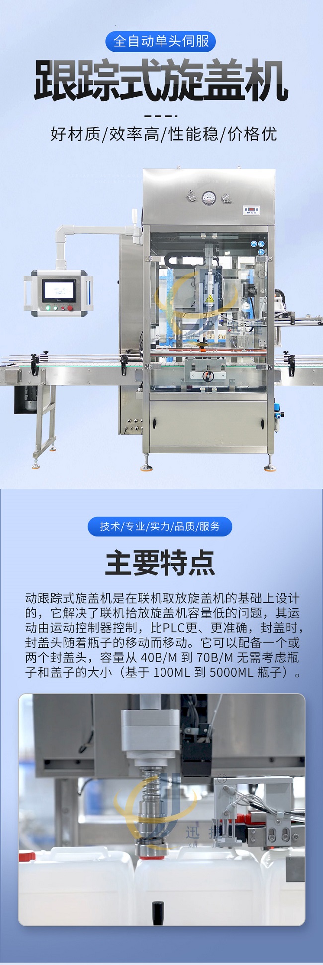 跟蹤式旋蓋機(jī)是在聯(lián)機(jī)取放旋蓋機(jī)的基礎(chǔ)上設(shè)計的,它解決了聯(lián)機(jī)拾放旋蓋機(jī)容量低的問題,其運(yùn)動由運(yùn)動控制器控制,比PLC更、更準(zhǔn)確,封蓋時,封蓋頭隨著瓶子的移動而移動。它可以配備一個或兩個封蓋頭,容量從 40B/M 到70B/M 無需考慮瓶子和蓋子的大小(基于 100ML到5000ML瓶子)。