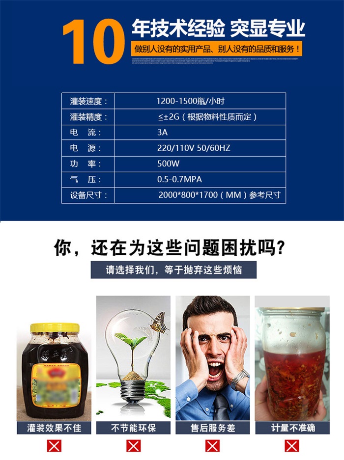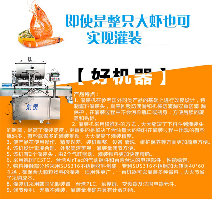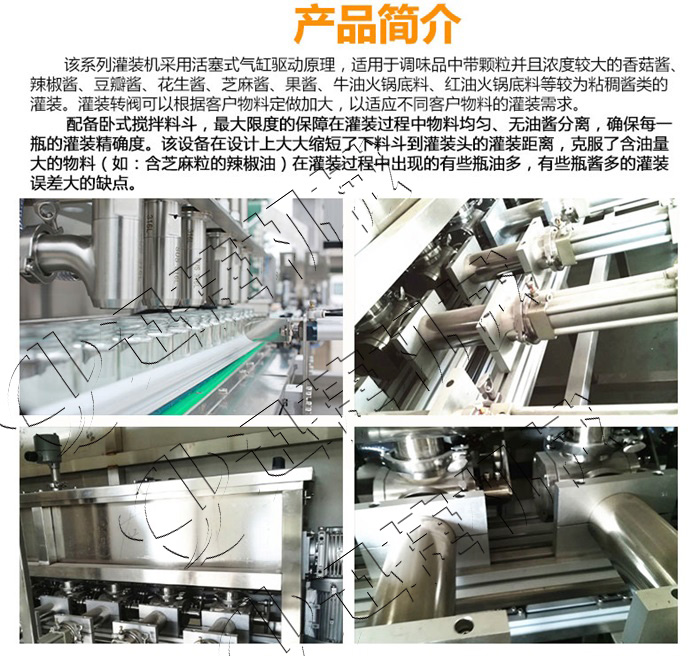 該系列灌裝機(jī)采用活塞式氣缸氣動(dòng)原理,適用于調(diào)味品中帶顆粒并且濃度較大的香菇醬、辣椒醬、豆瓣醬、花生醬、芝麻醬、果醬、牛油火鍋底料、紅油火鍋底料等較為粘稠醬類的灌裝。灌裝轉(zhuǎn)閥可以很具客戶物料定做加大,以適應(yīng)不同客戶物料的灌裝需求。