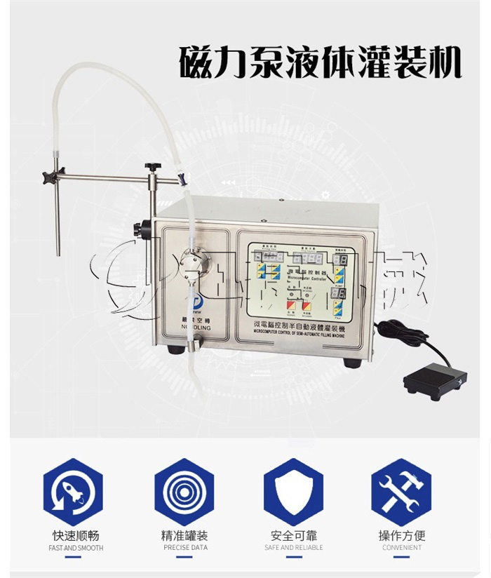 磁力泵液體灌裝機又名半自動液體灌裝機,雙頭液體灌裝機等,自身采用自吸式泵及泵轉(zhuǎn)速和泵的工作時間來測定灌裝量的新型液體灌裝機。磁力泵液體灌裝機廣泛適用于化妝品、醫(yī)藥、農(nóng)藥、化工產(chǎn)品等無腐蝕性液體的灌裝。磁力泵液體灌裝機結(jié)構(gòu)簡單,操作方便。并可將出料嘴加長,皮管任意移動灌裝,能滿足5ml以上無限量(任意可調(diào))灌裝容量要求,并不受灌裝容量的限制,是一種可靠耐用的磁力泵液體灌裝機。