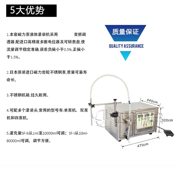 A、磁力泵液體灌裝機采用世界工廠變頻調(diào)速器,配進口高精度多圈電位器及可鎖表盤,使流量調(diào)節(jié)穩(wěn)定準(zhǔn)確,誤差負偏小于0.5%,正偏小于1.5%;
