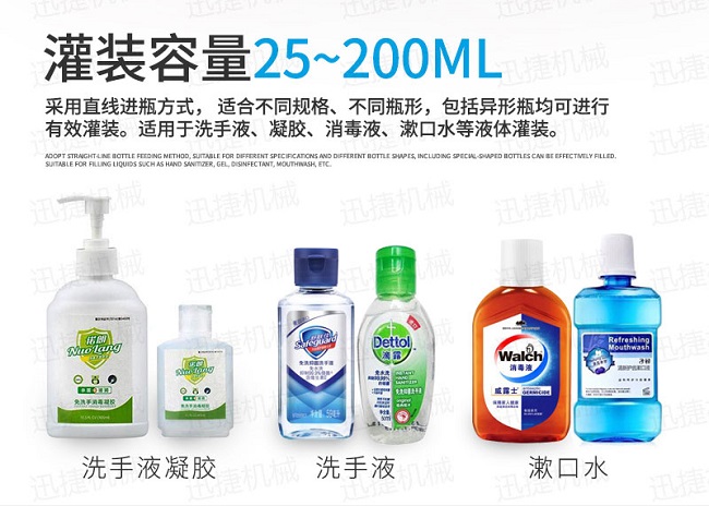 我們的雙手需要接觸的物品是在太多,在我們不能確定手是否清潔時要避免用手接觸口鼻和眼睛,這樣做還是有好處的,大大降低了病毒入侵我們的身體。洗手是相當(dāng)有必要的,其使用免洗手消毒液洗手那更是萬全之策,然而我們迅捷機械研發(fā)生產(chǎn)出免洗手消毒液灌裝生產(chǎn)線,自動化消毒液灌裝生產(chǎn)線是為市場對年洗手消毒液的需求而研發(fā)誕生的,該設(shè)備自動化程度高,性能穩(wěn)定,生產(chǎn)速度快,灌裝準確,操作簡單、調(diào)整方便,適應(yīng)性強等特點,免洗手消毒液灌裝生產(chǎn)線是相關(guān)行業(yè)必備的現(xiàn)代化灌裝機械設(shè)備。